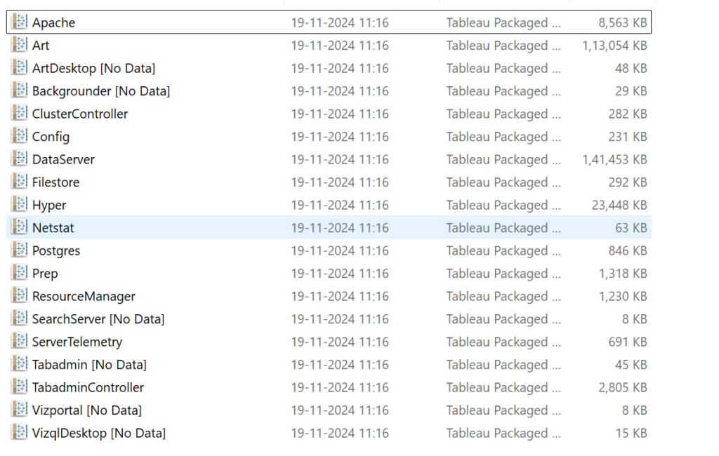 - This generates a .zip file containing logs related to VizQL, Apache, Backgrounder, etc.