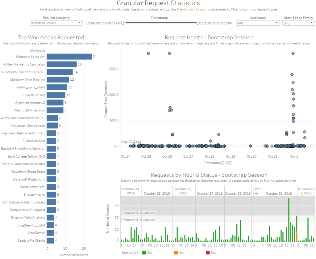 | Apache | Apache.twbx | Collect and analyze workbook statistics on Tableau Server from the Apache (http) log files, including viz load times, view counts, errors, and warnings. |